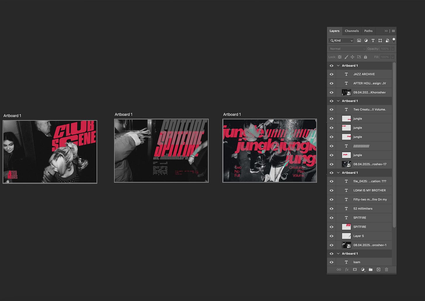 When I (Yuno) first got my hands on Clay’s photos, we were sitting in a café. I already had a direction in mind. I knew I wanted movement, layers, motion blur, and text that lives inside the photo — not just over it. We didn’t want it clean. We wanted it honest.